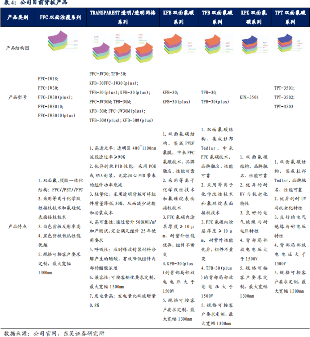 公司背板产品线覆盖广、性能佳。公司的背板产品涵盖了传统双面氟膜背板,也包括更具降本优势的 FFC 涂覆型背板、更能满足组件双面发电需要的透明背板,经过十多年的户外应用实证,公司生产的背板凭借高质量稳定的产品性能,在业内树立了良好的口碑,积累了一批优质稳定的客户资源。