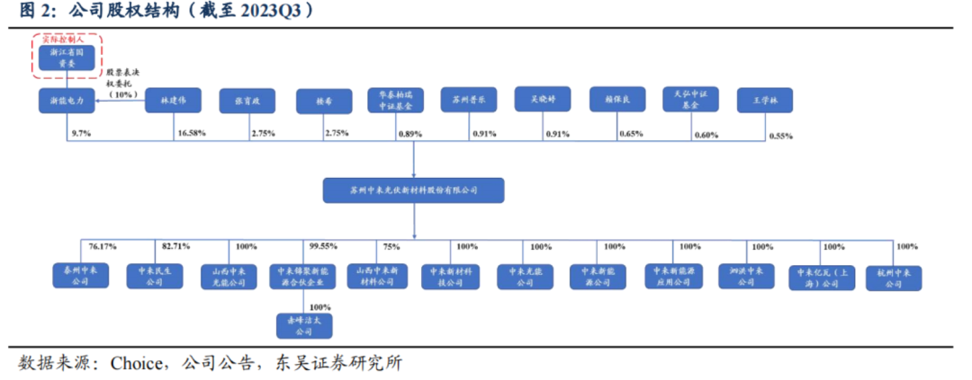 公司实际控制人为浙江省人民政府国有资产监督管理委员会。2022 年 11 月 10 日,原实控人林建伟、张育政与浙能电力签署《股份转让协议》,本次交易完成后,浙能电力持有公司股份 1.06 亿股,占公司总股本的 9.70%,并控制公司 2.15 亿股表决权,占公司总股本的 19.70%,实控人也转变成了浙江省国资委。公司旗下包括泰州中来光电科技有限公司、苏州中来民生能源有限公司、江苏中来新材科技有限公司等。其中,苏州中来光伏新材股份有限公司专注于研发制造光伏先进背板材料,泰州中来光电科技有限公司和山西中来光能电池科技有限公司致力于研发 N 型 TOPCon 双面电池及组件,苏州中来民生能源有限公司侧重分布式新能源领域的集成服务。