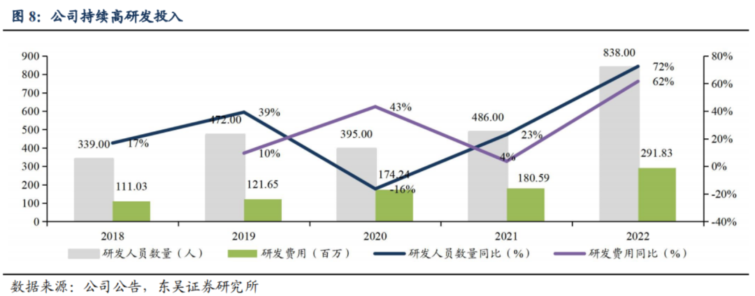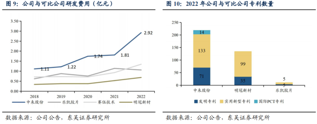 公司研发投入高,专利布局多,始终保持技术领先。自 2018 年起,公司研发费用逐年稳增,2022 年,公司投入的研发费用高达 291.83 百万元,远超可比公司,为新技术的研发提供稳定、充足的资金来源。此外,公司的专利数量超过 200 个,技术优势地位显著。