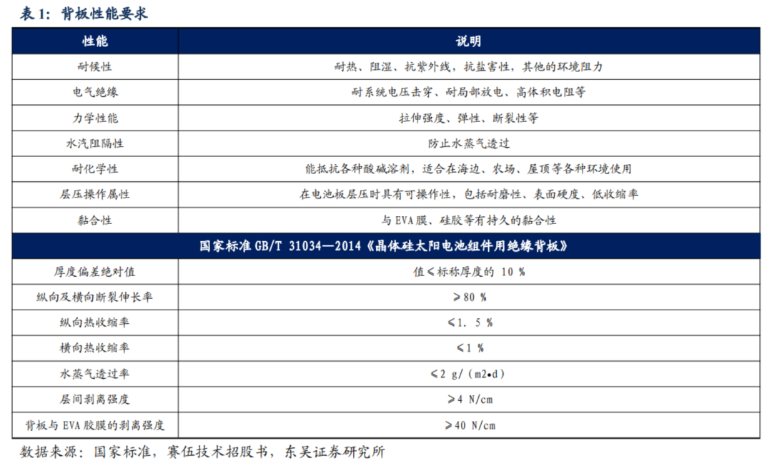 光伏背板是光伏组件背面最外层的封装材料,起到重要的保护作用。为保障光伏发电设备能在包括高原、沙漠、水面、建筑屋顶等场景连续使用 25 年以上,作为用于封装晶硅太阳能电池片形成组件的关键部分之一的背板需要满足如表1所示的多种性能要求。虽然背板成本只占组件成本的 5.2%,但它有重要的密封、保护、绝缘作用。