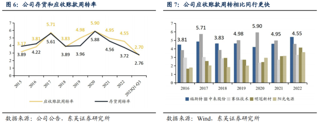 公司存货和应收账款周转快,相比同行资金回收期更短。2019-2022 年公司应收账款周转率、存货周转率分别为 4.98/5.90/4.95/4.55、3.96/5.88/4.56/3.72,在同业公司中保持相对优势地位。