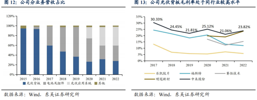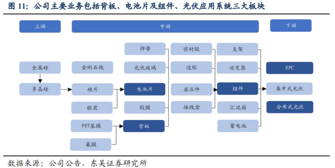 公司主要产品和业务包括背板、TOPCon 电池组件、光伏应用系统三大板块。其中2022 年,光伏背板营业收入达 27.14 亿元,占营业收入比重的 28.35%;电池及组件营业收入达 30.33 亿元,占营业收入比重的 31.67%;光伏应用系统营业收入达 36.75 亿元,占营业收入比重的 38.38%。