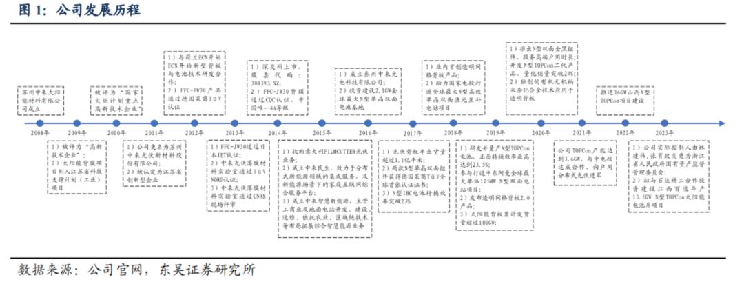 从背板到分布式光伏,深耕光伏行业,聚焦绿色能源产业链。公司自背板业务起家,研发的 FFC 涂覆型背板打破国外垄断,实现有效降本;2016 年,公司进入光伏电池领域,布局 N 型电池,目前已进入 J-TOPCon 技术 2.0 阶段;同时,2016 年以来,公司探索并逐步打通了下游分布式集成服务业务,切入光伏电站,推动分布式光伏项目实施。