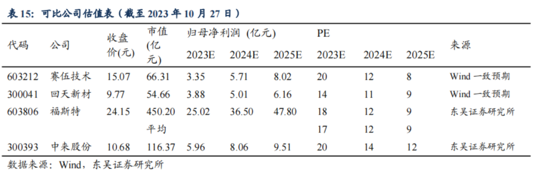 考虑公司背板龙头地位、电池组件和光伏应用系统蓬勃发展,我们预计公司2023-2025 年归母净利润为 5.96/8.06/9.51 亿元,同比增长 49%/35%/18%,对应 EPS 为0.55/0.74/0.87 元。如下图所示,可比公司的 2024 年动态 PE 均值为 12 倍,考虑公司技术、协作等方面的优势,给予公司 2024 年 15xPE,对应目标价 11.10 元,首次覆盖,给予“增持”评级。