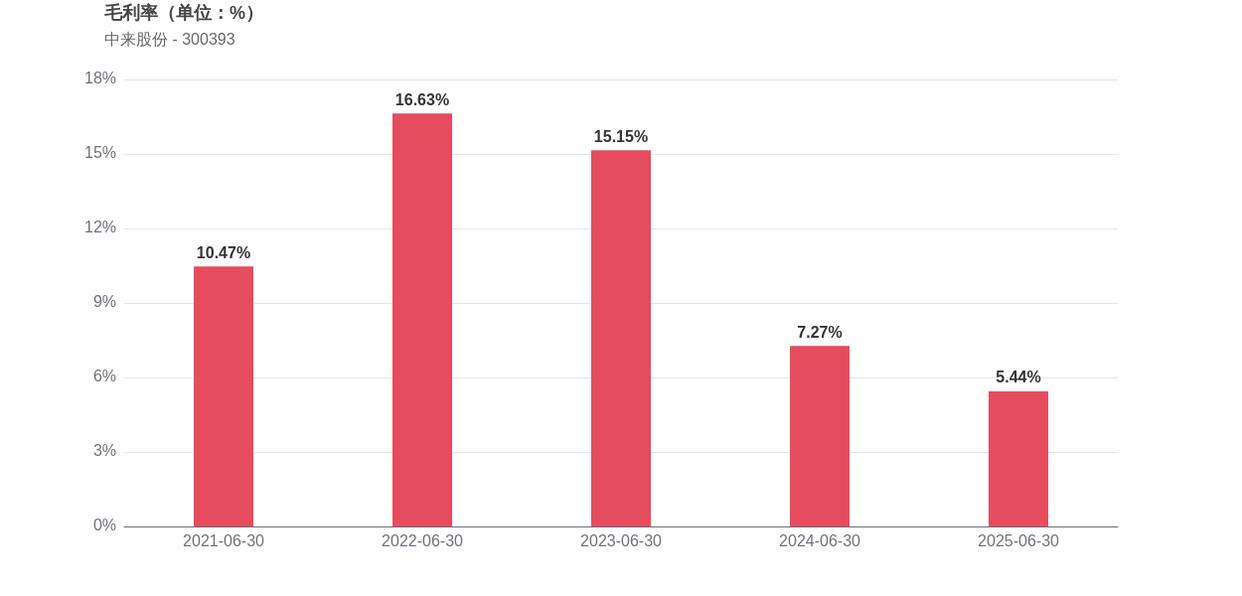 从反映盈利质量的指标来看,中来股份的净利率由2024年上半年的-11.27%提升至-4.45%,提升了6.82个百分点。毛利率从2024年上半年的7.27%下滑至5.44%,下降了1.84个百分点,已连续3年同期下滑。净资产收益率方面,2025年上半年为-5.15%,同比增长了2.06个百分点。