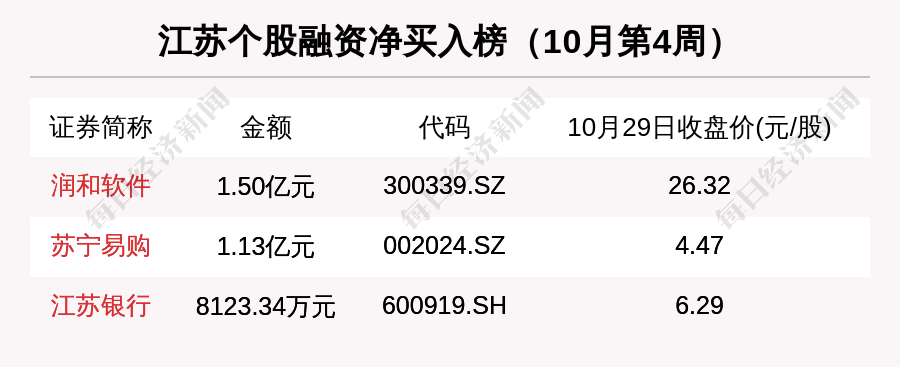 先看融资资金,10月第4周,江苏板块融资净偿还总额为9.59亿元。融资净买入最多的江苏股是润和软件,金额是1.50亿元。其次是苏宁易购(1.13亿元)和江苏银行(8123.34万元)。