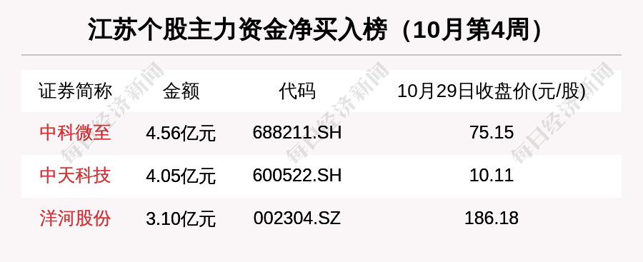 主力资金方面,10月第4周,中科微至净买入额居首位,为4.56亿元,其次是中天科技(4.05亿元)和洋河股份(3.10亿元)。