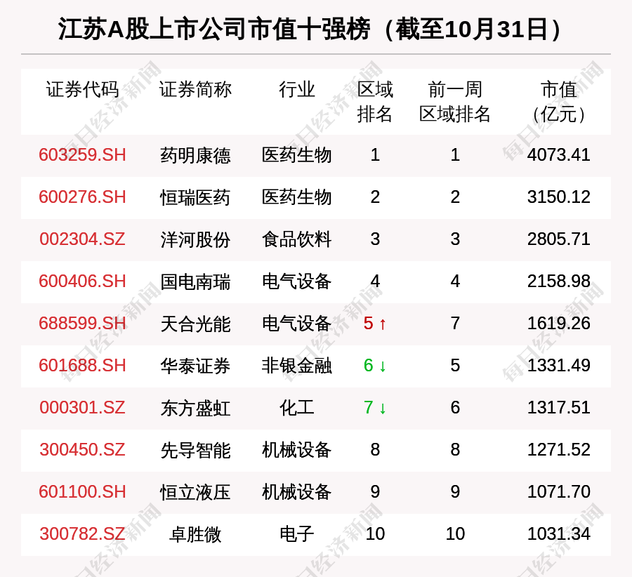 截至10月31日,江苏板块市值最大的是药明康德,市值最小的是*ST科林。上周市值增长最多的是天合光能,增长323.44亿元;市值缩水最多的是恒瑞医药,缩水131.79亿元。