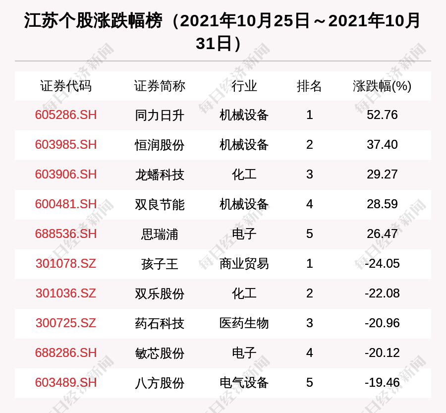 从涨跌幅来看,上周涨幅最大的江苏公司是同力日升,上涨幅度为52.76%。跌幅最大的是孩子王,下跌幅度为24.05%。