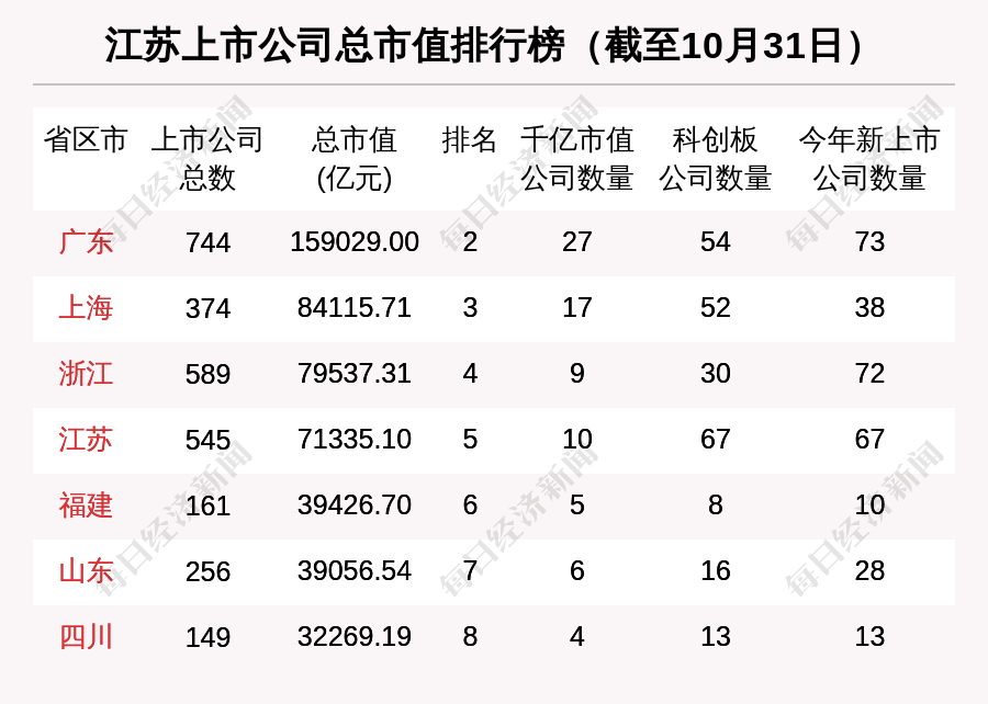 据统计,与浙江相比,江苏上市公司总数比浙江少44家;千亿市值公司数量比浙江多1家;科创板公司数量比浙江多37家;今年新上市公司数量比浙江少5家。