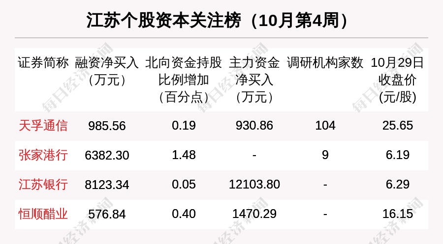 天孚通信被104家机构调研,且同时被主力资金、北向资金、融资资金看好。张家港行被9家机构调研,且同时被北向资金、融资资金看好。江苏银行、恒顺醋业同时被主力资金、北向资金、融资资金看好。