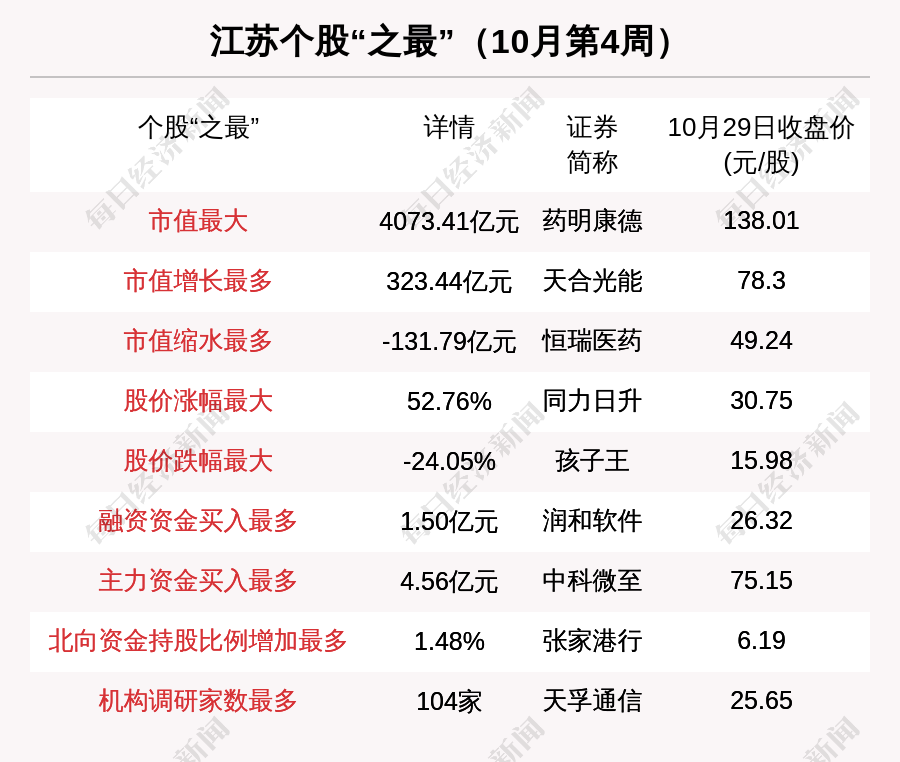 10月第4周(2021年10月25日~2021年10月31日),江苏股中,天合光能市值增长最多;恒瑞医药市值缩水最多;涨幅最大的是同力日升,上涨幅度为52.76%;跌幅最大的是孩子王。此外,天孚通信被104家机构调研,且同时被主力资金、北向资金、融资资金看好。