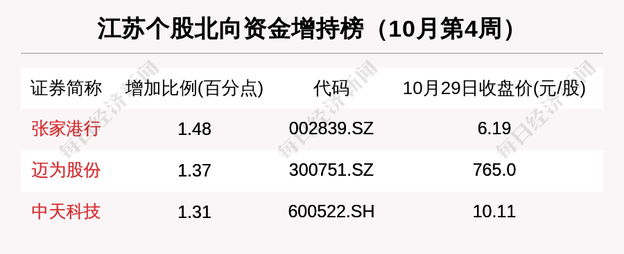 再看北向资金,10月第4周,张家港行北向资金持股比例增加1.48个百分点,迈为股份北向资金持股比例增加1.37个百分点,中天科技北向资金持股比例增加1.31个百分点。