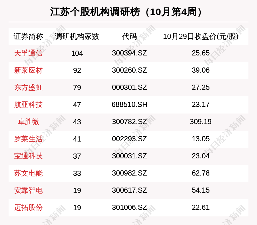 机构调研方面,据统计,10月第4周,有24家江苏上市公司接受机构调研。其中,104家机构到访天孚通信,92家机构到访新莱应材,79家机构到访东方盛虹,47家机构到访航亚科技,43家机构到访卓胜微。