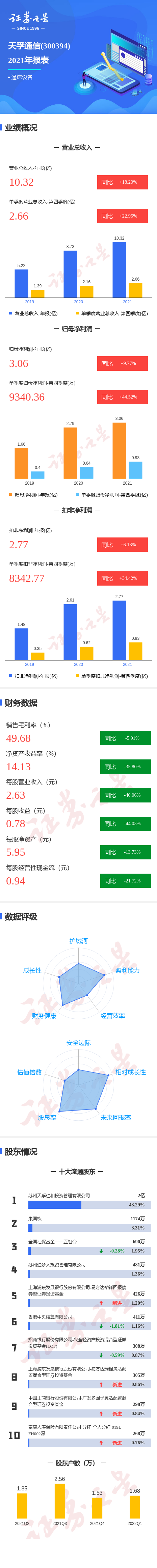 天孚通信2021年报显示,公司主营收入10.32亿元,同比上升18.2%;归母净利润3.06亿元,同比上升9.77%;扣非净利润2.77亿元,同比上升6.13%;其中2021年第四季度,公司单季度主营收入2.66亿元,同比上升22.95%;单季度归母净利润9340.37万元,同比上升44.52%;单季度扣非净利润8342.77万元,同比上升34.42%;负债率8.42%,投资收益1744.26万元,财务费用-438.29万元,毛利率49.68%。