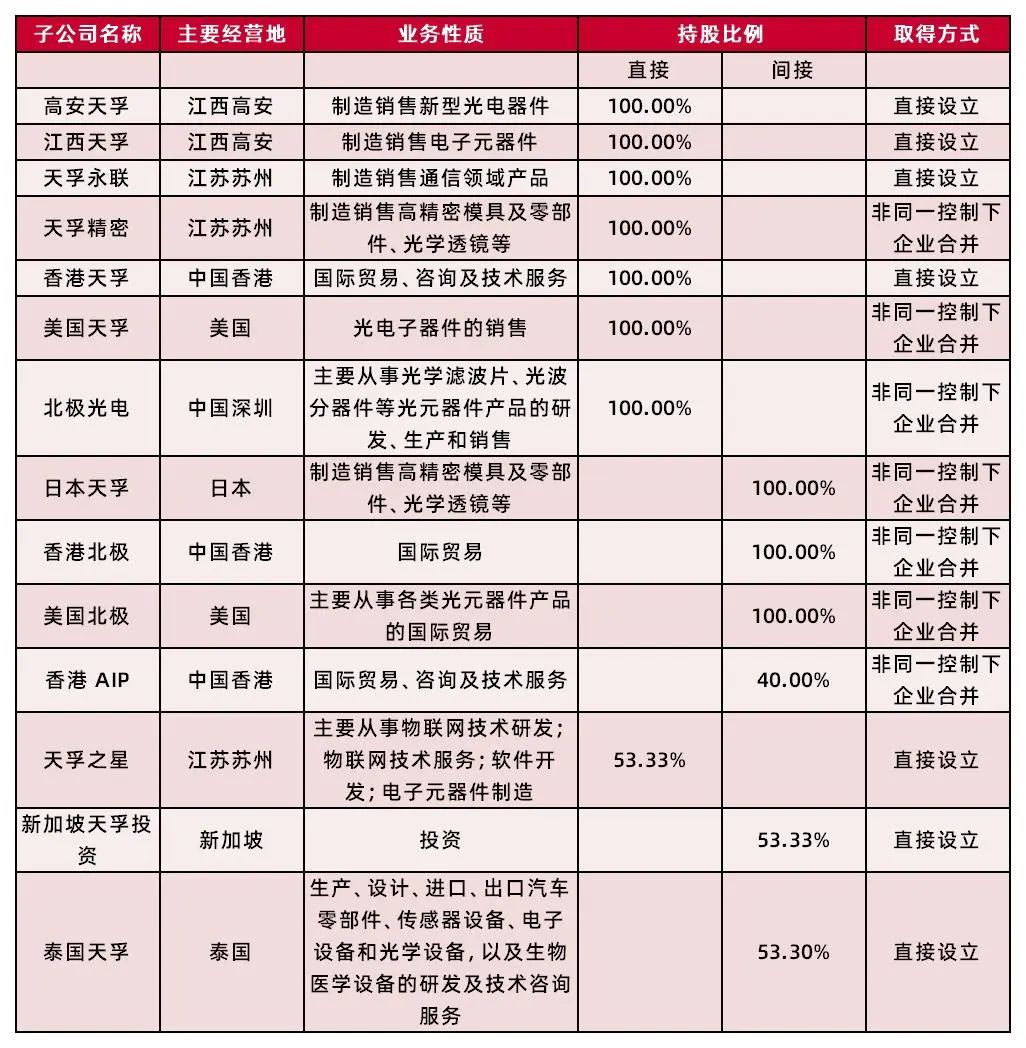 公司通过自主投资和股权收购等形式,在中国香港、深圳、武汉等地和日本、美国、新加坡、泰国等国家相继设立了分子公司,分工进行生产制造及扩大销售网络。其中,高安天孚主要负责生产公司传统无源产品,江西天孚主要负责生产公司上市后拓展的光纤透镜、隔离器、镀膜、 AWG 阵列波导光栅等产品;2020年公司收购天孚精密和北极光电,北极光电主营光学滤波片、光波分器件等元器件,公司产品矩阵进一步扩大,目前已形成了以苏州为总部和研发中心;日本和深圳为研发分支;美国、新加坡、香港、深圳、武汉为销售分支;江西、深圳和苏州为量产基地的全球网状布局,同时23H1公司新建泰国工厂,推动产能全球布局。