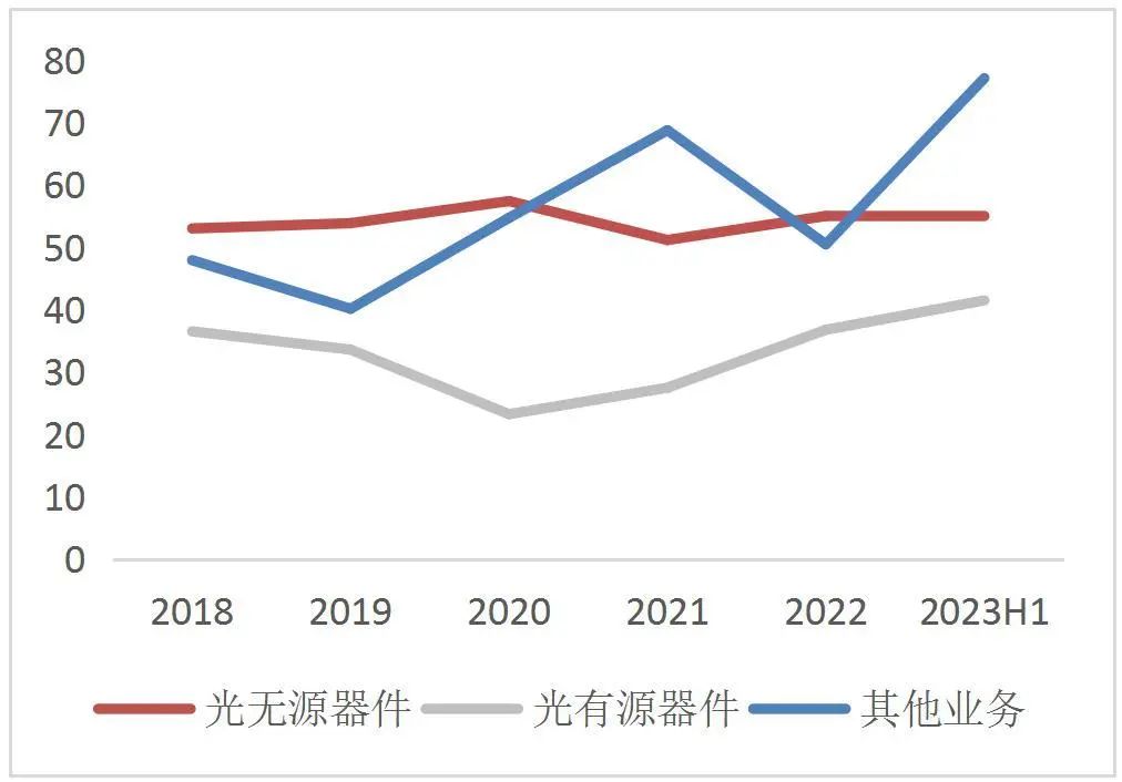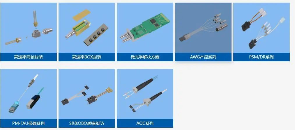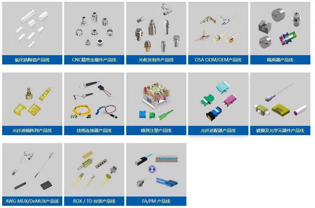 目前公司围绕八大解决方案形成十三大产品线,解决方案分为高端无源器件整体解决方案和高速光器件封装OEM方案,产品除上市前主营业务外新增光纤透镜/隔离器/线缆连接器/AWG/镀膜等产品线,形成了波分复用耦合技术、 FAU 光纤阵列设计制造技术、 TO-CAN/BOX 芯片封测技术、并行光学设计制造技术、光学元件镀膜技术、纳米级精密模具设计制造技术、金属材料微米级制造技术、陶瓷材料成型烧结技术、 PLC 芯片加工测试等技术和创新平台,现已具备光模块上游配套光器件较为齐备品类量产能力,并可提供光器件垂直整合一站式产品解决方案。