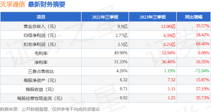 据证券之星公开数据整理,近期天孚通信(300394)发布2023年三季报。根据财报显示,本报告期中天孚通信营收净利润双双增长。截至本报告期末,公司营业总收入12.06亿元,同比上升35.57%,归母净利润4.39亿元,同比上升58.42%。按单季度数据看,第三季度营业总收入5.42亿元,同比上升73.62%,第三季度归母净利润2.03亿元,同比上升94.95%。
