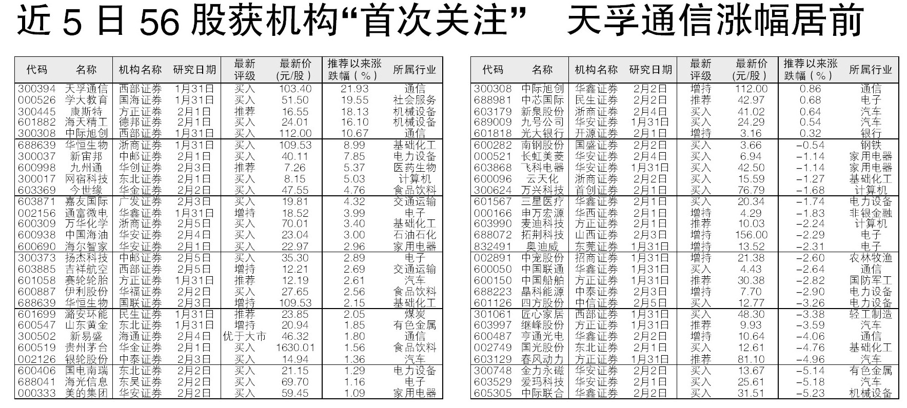近5日56股获机构“首次关注” 天孚通信涨幅居前
