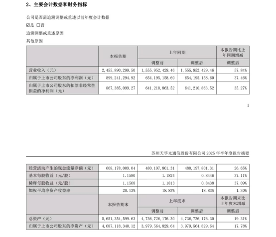 8月25日,天孚通信披露2025年半年度报告,公司上半年实现营业收入24.56亿元,同比增长57.84%;实现归母净利润8.99亿元,同比增长37.46%。截至8月27日收盘,天孚通信股价于前一日大涨11.93%,27日再度上涨3.61%,报收150.01元,总市值达1166亿元。