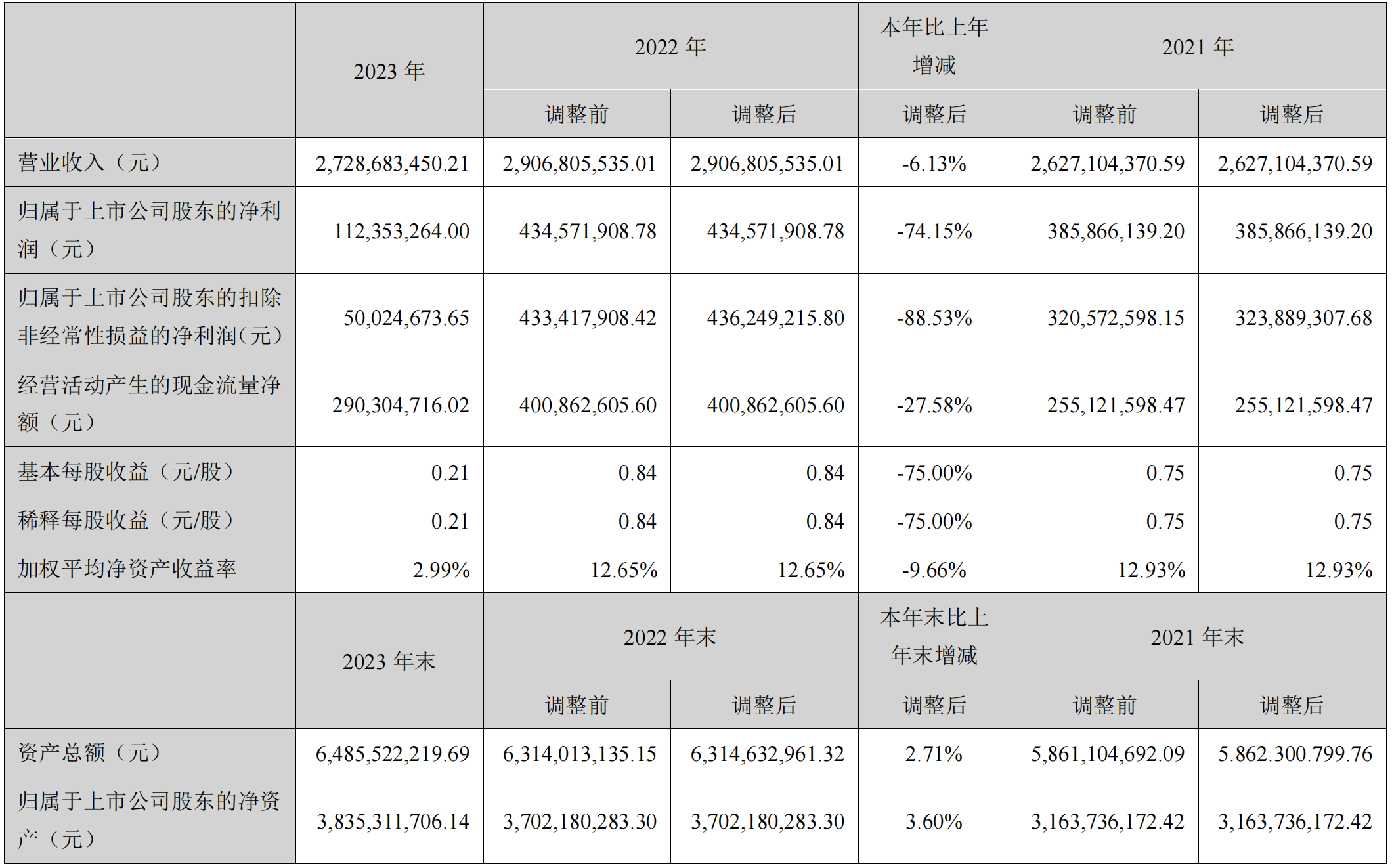 集微网消息,4月28日,飞凯材料发布了2023年年报。报告显示,2023年,公司实现营业收入27.29亿元,同比下降6.13%;实现归属于上市公司股东的净利润1.12亿元,同比下降74.15%;扣除非经常性损益的净利润为5002.47万元,比上年同期下降88.53%。基本每股收益0.21元,同比减少75%。