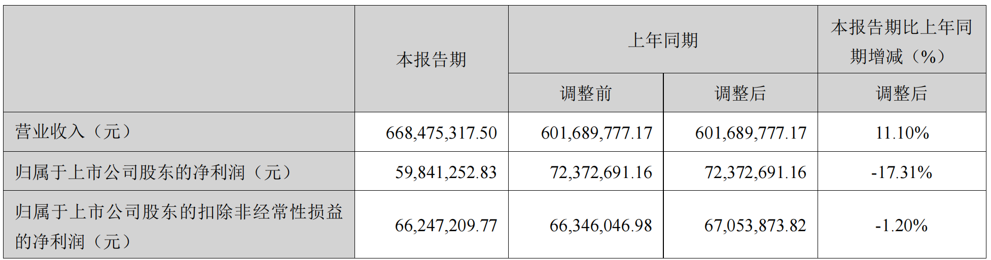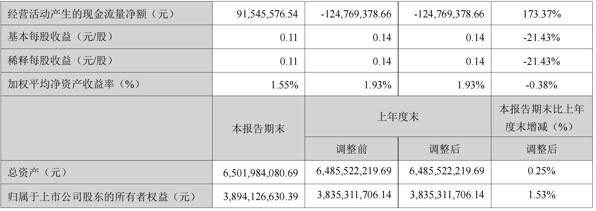 公司销售毛利率为35.51%,同比下降3.39个百分点,实现基本每股收益0.11元,同比下降21.43%,摊薄净资产收益率为1.54%,同比下降0.38个百分点。