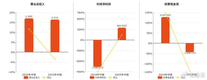 公司营业总收入为2.31亿元。归母净利润为802.05万元,较去年同报告期归母净利润增加2592.61万元。经营活动现金净流入为-1109.37万元。