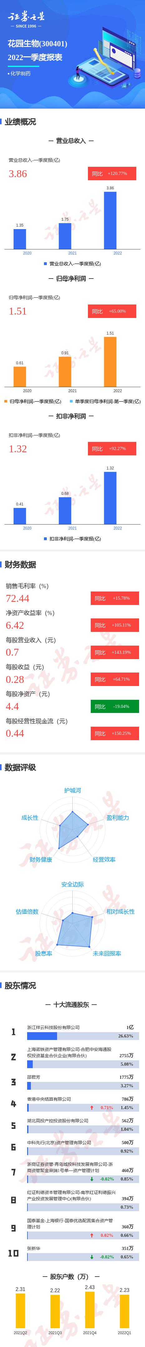 花园生物2022一季报显示,公司主营收入3.87亿元,同比上升120.77%;归母净利润1.51亿元,同比上升65.0%;扣非净利润1.32亿元,同比上升92.27%;其中2022年第一季度,公司单季度主营收入3.87亿元,同比上升120.77%;单季度归母净利润1.51亿元,同比上升65.0%;单季度扣非净利润1.32亿元,同比上升92.27%;负债率37.31%,财务费用434.69万元,毛利率72.44%。