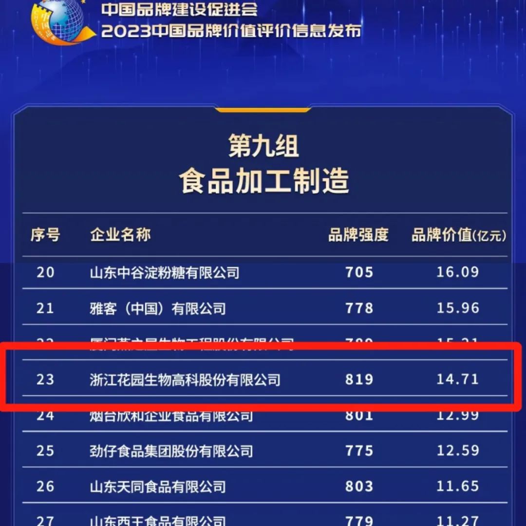 近期,新华社、浙江省人民政府、中国品牌建设促进会、中国资产评估协会等单位联合发布“2023中国品牌价值评价信息”。浙江花园生物高科股份有限公司(现更名为浙江花园生物医药股份有限公司)首次参加评价,并以14.71亿元的品牌价值入选全国“食品加工制造”领域榜单。