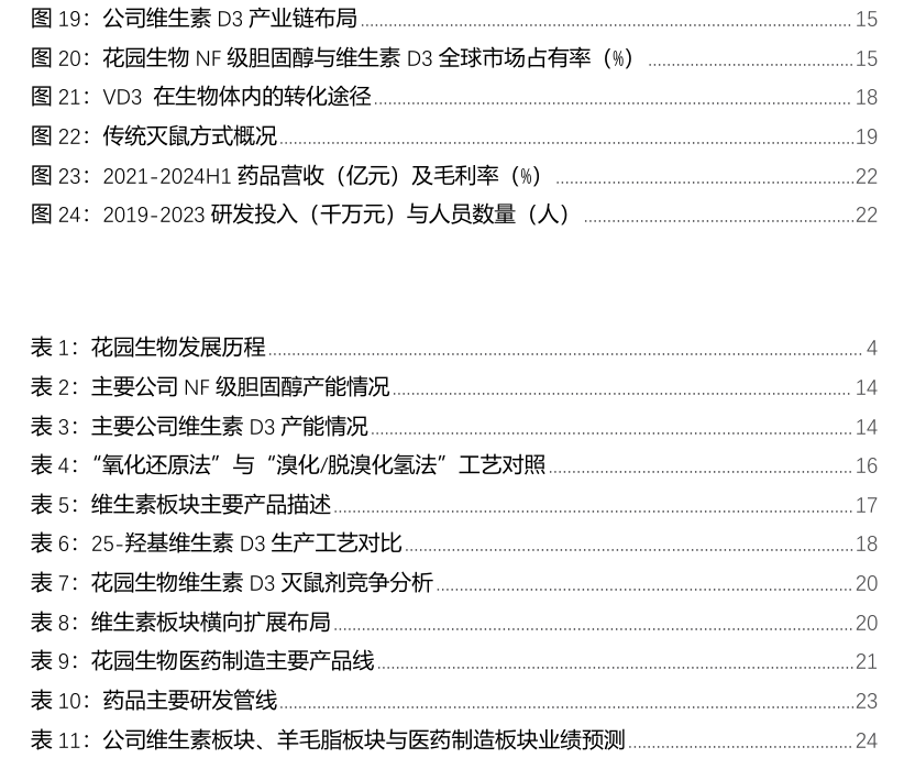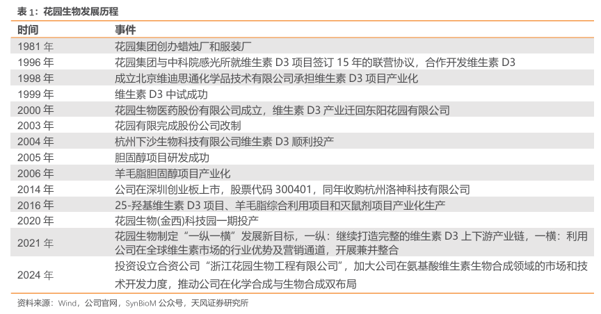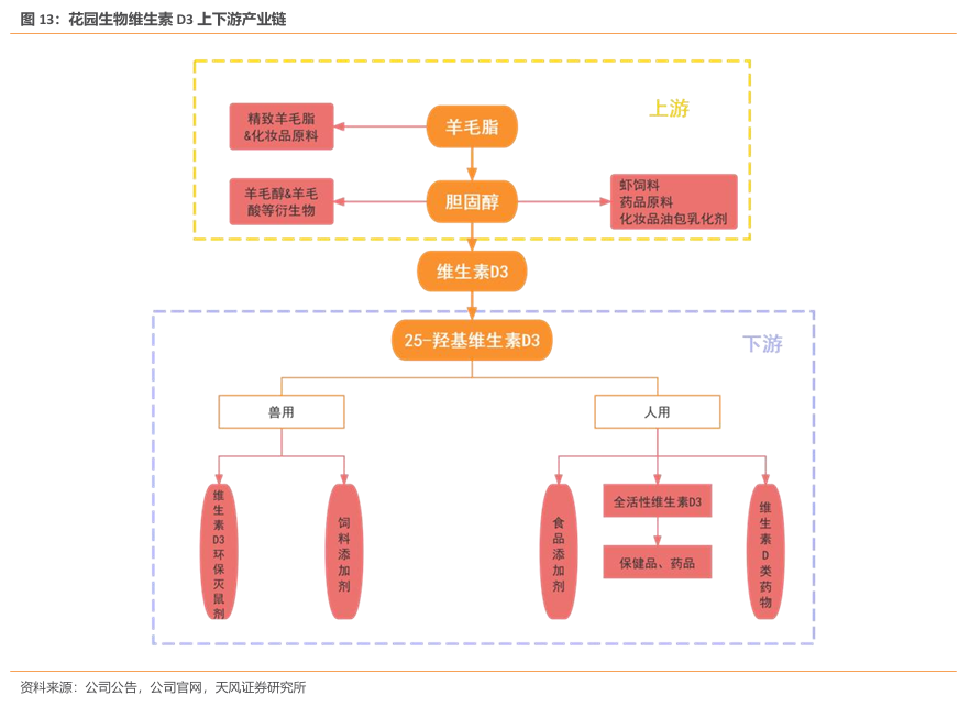 全球领先VD3龙头企业。浙江花园生物医药股份有限公司成立于2000年。公司已建成行业领先的维生素D3产业链;拥有三大核心技术,NF胆固醇生产工艺、维生素D3生产工艺、25-羟基维生素D3生产工艺;经营四大类产品:羊毛脂胆固醇、维生素D3、25-羟基维生素D3和精制羊毛脂,拥有很强的主导权和定价权。公司将持续布局化学合成、生物合成两大领域,不断推进“一纵一横”发展战略。产能方面,公司目前有两个主要生产基地,东阳基地主要生产食品医药级维生素 D3、25-羟基维生素 D3 等,金华基地主要生产胆固醇、饲料级维生素 D3、精制羊毛脂等。未来,东阳生产基地现有产品线将逐步由金华生产基地承接。