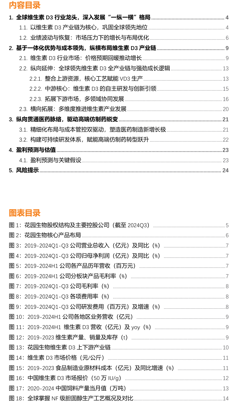 凭借全产业链的整合能力,公司在调节维生素D3市场供需关系上表现出色。随着部分企业因亏损而减产或停产,供应减少的同时,下游需求,特别是养殖业的复苏,推动了维生素D3价格的上涨。在此背景下,花园生物的市场竞争力得到加强。随着养殖企业盈利水平的进一步回升,饲料级维生素D3的需求将持续改善。此外,食品和医药领域对高端维生素D3的需求稳步增长,也为公司提供了扩展机会。结合行业供需动态,我们认为维生素D3价格预计将持续回升,进一步推动花园生物的业务增长。