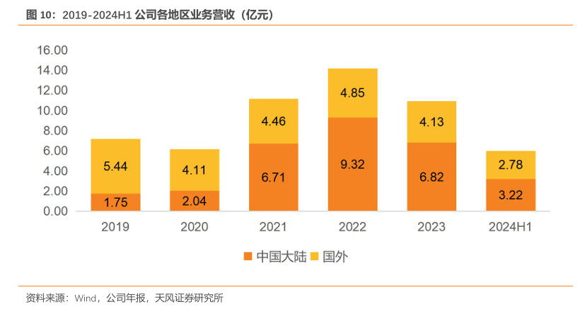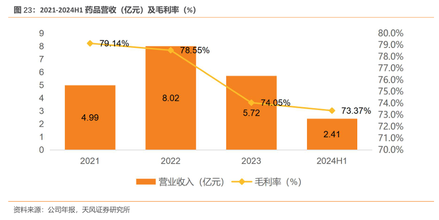 营收与毛利率的表现凸显双轮驱动的力量。公司医药板块营业收入从2021年的4.99亿元增长至2022年8.02亿元,2023年营收虽有所下降,但从毛利率来看,仍以74.05%保持在高位。2023年毛利率经历明显下降,但到2024H1下降趋势放缓。从公司拓展药品业务至今,药品毛利率整体维持在较高水平。