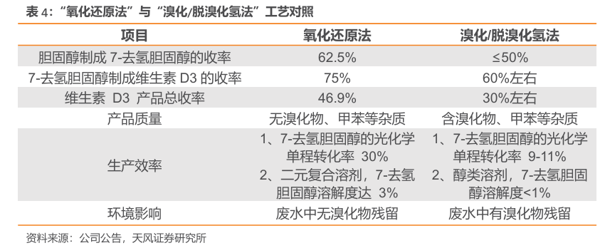 独创“氧化还原法”生产维生素D3革新生产工艺,打破国外企业长期桎梏,挺立行业前沿。维生素D3自从分离出世,人类开始大规模尝试生产。传统的“溴化/脱溴化氢法”被荷兰苏威、瑞士罗氏、德国巴斯夫所垄断掌握,直至1999年花园集团联合中科院理化所研发成功了独创性的“氧化还原法”。相比传统的“溴化/脱溴化氢法”,氧化还原法不仅将7-去氢胆固醇的收率提升至62.5%,维生素D3的总收率提升至46.9%,同时大幅降低了生产成本和环境污染。凭借这一突破,产品质量显著提升,脱颖于全球维生素D3市场。
