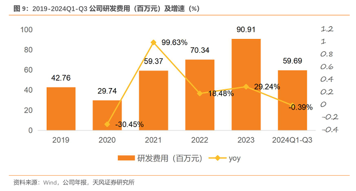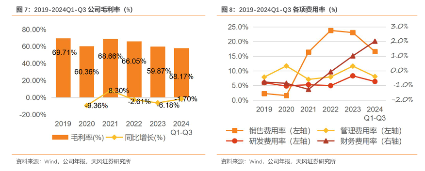 公司整体毛利率维持在60-70%左右,整体表现较为稳定。2019年和2020年毛利率经历轻微波动下滑,2021年毛利率回升至68.66%,随后2022年因市场环境变化出现小幅回落,主要受以下因素影响:(1)维生素D3市场价格从110元/公斤跌破80元/公斤后,持续徘徊低位(约60元/公斤);(2)营业成本增加131.15百万元,其中原材料成本增长明显,增量达到74.5百万元。2023年和2024第三季度,在公司优化成本结构和加强市场布局的努力下,毛利率降幅逐步收窄,2024年上半年降幅较2023年有所缓和,显示出一定的企稳迹象。