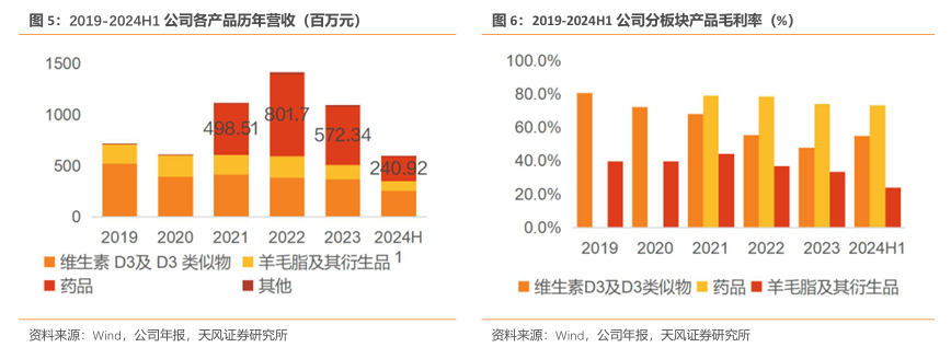 维生素D3产业链收入下降,核心地位保持不变。维生素D3及其类似物与羊毛脂及其衍生品的收入从2019年的7.11亿元逐年下降至2023年的5.08亿元,而药品收入在2021年为4.99亿元,之后在2023年显著上升至5.72亿元。花园生物的维生素D3产业链虽然在收入结构中的占比有所下降,但仍然是公司业务的核心部分。维生素D3产业受市场压力出现下滑趋势,但在2024H1出现逆转,有望伴随市场价格回暖而增加。羊毛脂及其衍生物与药品的毛利率略有波动,但仍保持较高毛利。