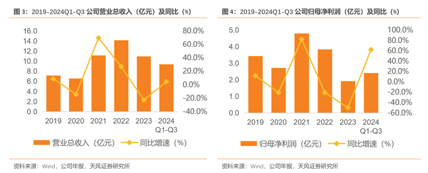 维生素D3市场价格从50元/公斤低位反弹跃升至2024Q3的250元/公斤。2024Q1-Q3,花园生物实现累计营收9.38亿元,归母净利润2.41亿元。依托全产业链布局优势,公司在成本控制和市场拓展上展现市场适应能力与复苏潜力,预计未来增长态势将得以延续。