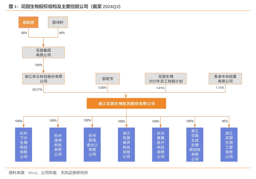股权结构稳定,子公司布局广泛。截至2024Q3,花园生物公司实控人为邵钦祥先生,持股比例为15.94%。花园集团从1981年创办蜡烛厂和服装厂开始,经过40多年的创业创新,已经形成以高科技产业为主导,新兴产业和传统产业相配套的经济发展格局。作为花园集团生物医药产业代表企业,花园生物公司是国家高新技术企业和国家级“专精特新”小巨人企业,已成为全球最大的维生素D3生产和出口企业之一。邵钦祥先生历任花园集团有限公司董事长和浙江花园生物医药股份有限公司提名委员。旗下拥有十家全资及控股子公司,涵盖生物科技、医疗器械、营养科技等多个领域。形成从原材料到制剂的完整产业链,增强整体的产业链延展性和市场竞争力。