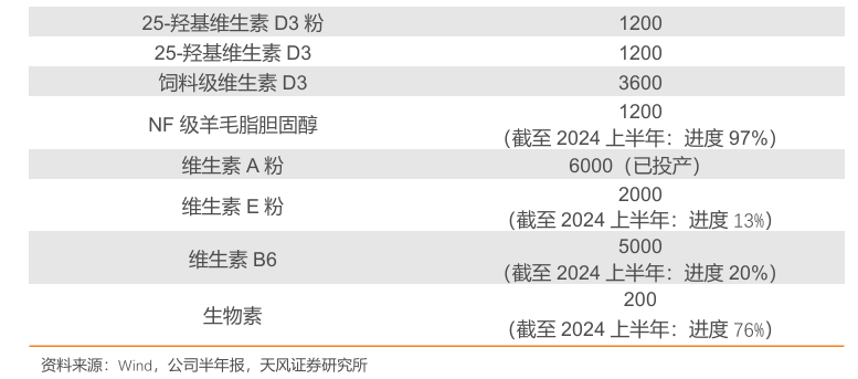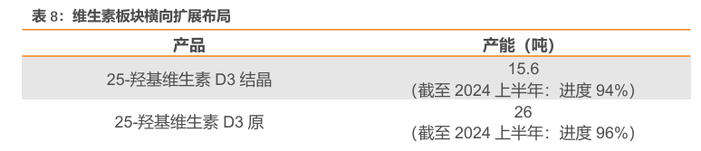 多维度横向拓展和持续的研发创新,实现单一产品到多维生素产品的转型,进一步巩固其全球市场的主导地位。公司在25-羟基维生素D3、饲料级和食品级维生素D3、维生素A粉、维生素E粉、维生素B6及生物素等产品上,扩大产能布局,逐步形成涵盖多种维生素的产品矩阵。构建完整产业链,推动多领域协同效应的发挥,助力业绩增长。