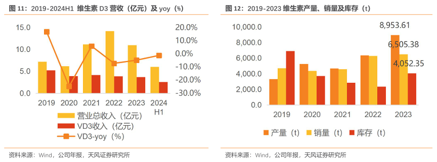 维生素D3是公司发展的基石,公司围绕维生素D3产品,构建了完整的上下游产业链,并扩展至化妆品原材料和医药保健品领域,已成为全球唯一的维生素D3全产业链生产企业。公司维生素板块主要产品为:羊毛脂胆固醇、维生素D3、25-羟基维生素D3等。2019年以来产量与销量呈现波动上升的态势,并在2023年创新高,库存的水平也维持在相对合理的范围内。