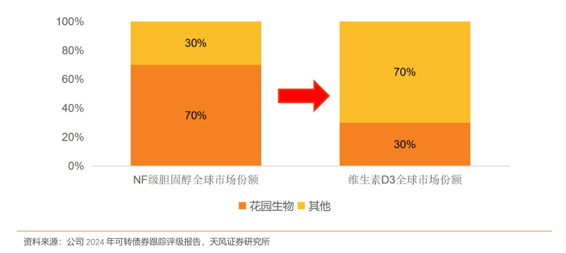 花园生物作为全球维生素D3产业链的龙头企业,依托自主的NF级胆固醇生产技术与25-羟基维生素D3合成工艺,掌握从羊毛脂胆固醇到25-羟基VD3的完整生产链,确保供应链稳定性。2024年,随着维生素D3市场复苏,公司通过核心产业链布局巩固全球市场主导地位。