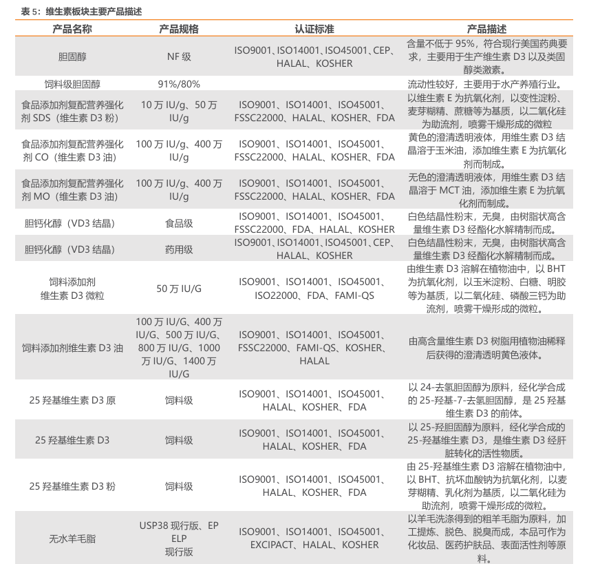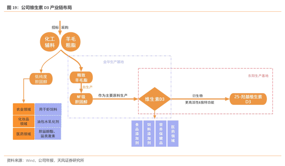 前端优势助力公司引领维生素D3行业市场。公司从上游的化工辅料和羊毛粗脂采购入手,自主生产精制羊毛脂和NF级胆固醇,尤其是NF级胆固醇的自主生产能力,使其打破国际垄断,跻身全球能够完全掌控关键原料的企业。前端优势确保维生素D3生产所需原材料的稳定供应,降低对外部供应链的依赖,提高整体生产的安全性和成本控制能力。