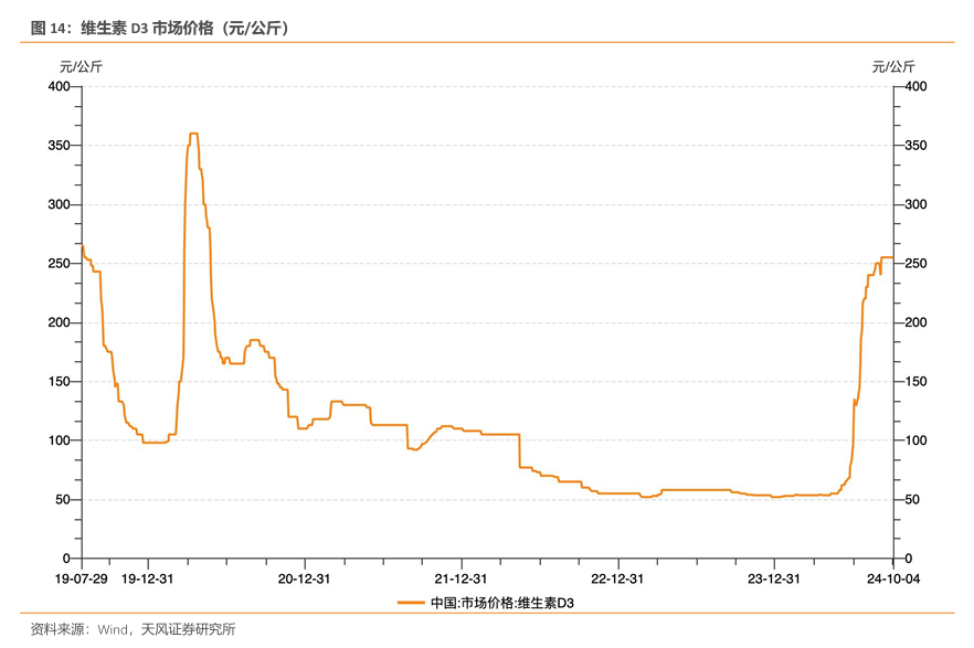 2024Q3 业绩明显提升。2024Q3公司营业收入实现3.37亿元(yoy+39.99%),归母净利润0.99 亿元(yoy+213.17%)。从年初至2024Q3,累计实现9.38亿元营收,2.41亿元归母净利润。收入与利润双增长主要系:(1)费用端的整体削减,销售费用减少57.55百万元,管理费用减少23.88百万元,显著降低了运营成本;(2)非经常性损益合计3,862.70万元,部分抵消营业收入下降对利润的负面影响,并推动了归母净利润的增长;(3)维生素D3市场价格触底反弹,于三季度从70元/公斤稳健回升到250元/公斤,带动公司营收增长。