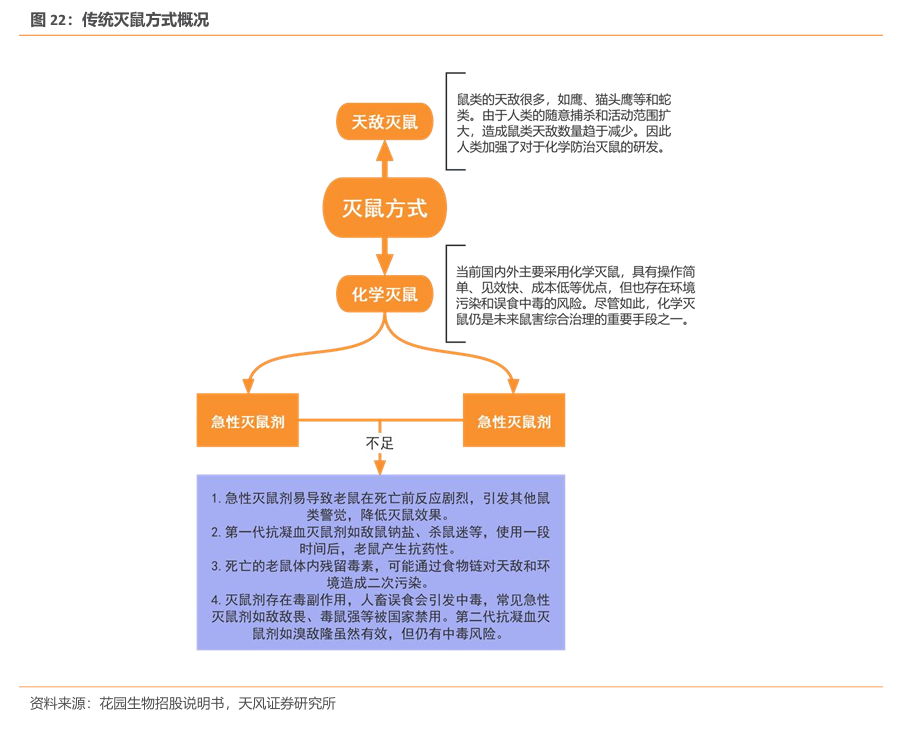 传统灭鼠方式分为天敌灭鼠和化学灭鼠两大类。天敌灭鼠利用自然界中的捕食者如猫头鹰和蛇等来控制鼠类数量,但由于人类活动的扩展,天敌的作用逐渐减弱,因此人类逐步加大对化学灭鼠的研究。化学灭鼠因其操作简便、见效快、成本低等优点成为主流方式,但同时也伴随着环境污染和中毒等风险。化学灭鼠中急性灭鼠剂和抗凝血灭鼠剂的不足之处:急性灭鼠剂在鼠类死亡前的强烈反应会引起其他鼠类警觉,降低灭鼠效果,而抗凝血灭鼠剂虽然有效,但长期使用可能导致鼠类产生抗药性。此外,死亡鼠体内残留的毒素会对天敌和环境造成二次污染,并有潜在的人畜误食风险,因此化学灭鼠仍需更加安全和可持续的解决方案。