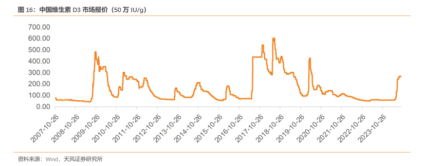 维生素D3的价格存在显著的周期性波动,主要由行业产能的增减、市场需求变化等因素驱动。维生素D3价格在2019年和2020年经历了多次波动,特别是在2023年价格触底之后,进入2024年出现了快速回升。饲料级维生素D3价格回暖主要受益于企业产能的减少以及下游养殖需求的回升。