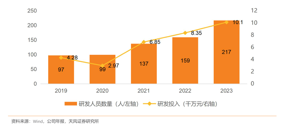 花园生物加大研发投入,展现出强劲的创新驱动力。2019年至2023年,公司研发投入从4.28 千万元增长至10.1千万元,年均复合增长率显著,研发人员数量也从97人增长至217人,人员规模翻倍。这样的研发投入与人才扩充同步进行,为公司在高技术壁垒领域积累充足的创新资源和强化竞争优势。