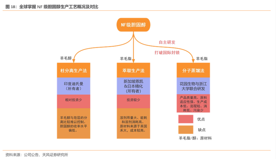 花园生物是NF级胆固醇全球主要生产企业之一,依托其核心的羊毛脂胆固醇提取技术,全面符合新国标要求。根据GB7300.202-2019新国标,国家明确规定,NF级胆固醇生产中只能使用羊毛脂作为合法原料,禁止使用动物脑干提取的胆固醇。以确保生产过程的安全性与环保性,同时降低动物源材料带来的卫生和质量风险。公司在此基础上,依托前端优势,公司确保供应链的顺畅,还在行业竞争中展现出显著的市场适应力。