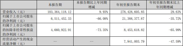 去年前三季度,公司实现营业收入2.78亿元,同比增长29.63%;实现归属于上市公司股东的净利润2138.84万元,同比减少35.72%;实现归属于上市公司股东的扣除非经常性损益的净利润845.36万元,同比减少65.99%;经营活动产生的现金流量净额为794.10万元。