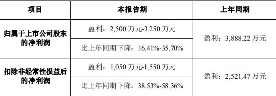 据公司2022年年度业绩预告,2022年,公司预计归属于上市公司股东的净利润盈利2500 万元-3250 万元,比上年同期下降16.41%-35.70%,上年同期盈利3888.22万元;扣除非经常性损益后的净利润预计盈利1050万元-1550万元,比上年同期下降38.53%-58.36%,上年同期盈利2521.47万元。