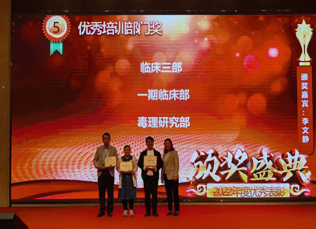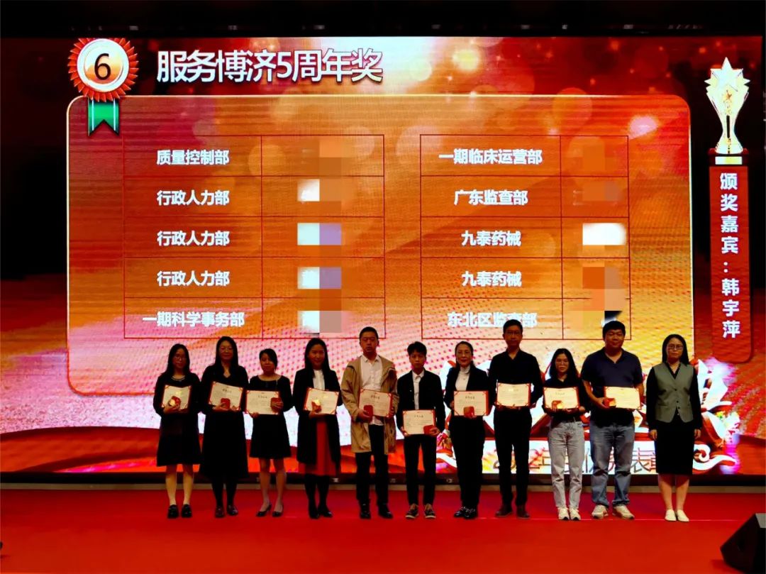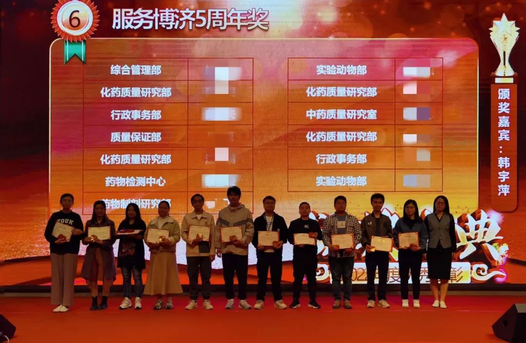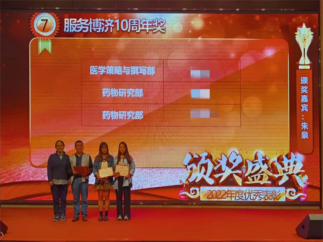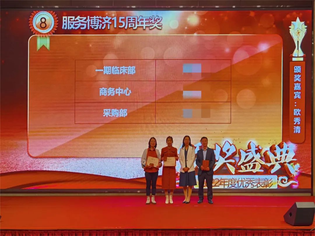 本次年会对2022年取得优异成绩的个人与团队给予了表彰,共有103名员工分别获得了优秀员工、最佳新人、爱岗敬业、优秀中高层的荣誉称号,有3个团队荣获优秀培训部门奖。此外,年会上还专门为服务博济医药满5年、满10年、满15年的员工颁发了“服务博济奖”和纪念金牌,感谢他们为博济医药发展奉献了自己的芳华。