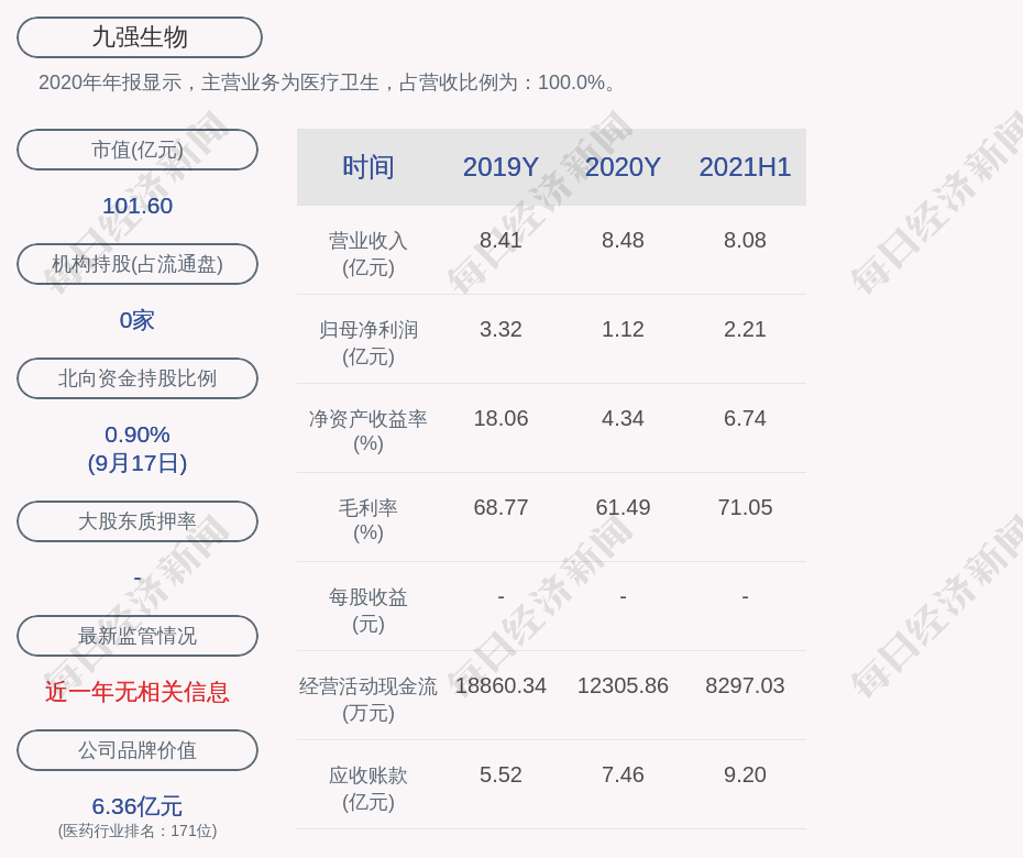 2020年年报显示,九强生物的主营业务为医疗卫生,占营收比例为:100.0%。